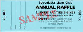 Thank you to all who supported the Speculator Lions Club by purchasing electric bike raffle tickets. The raffle drawing was held on August 23 at the conclusion of our annual Richard Newell Fly-in Drive-in Breakfast at Piseco Airport. Please support us again next year.